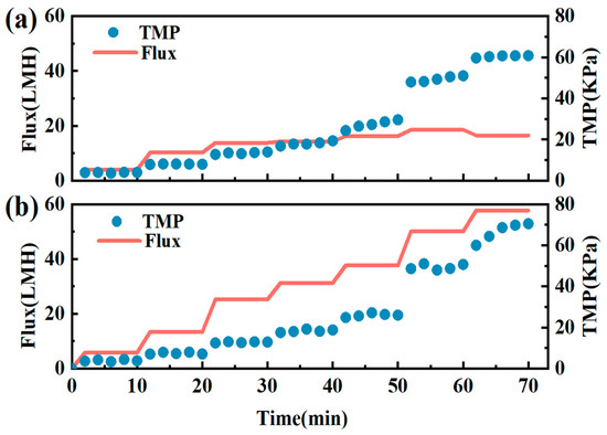 Critical flux measurements were conducted on a constant TMP basis by monitoring changes in permeate flux [26]. The TMP was gradually increased via stepping from 0 to 70 kPa with a step interval of 10 min. The simultaneous variation of TMP and flux with time were illustrated in Figure 2. Without the in situ cleaning device, the critical flux of ceramic membrane was 16.25 LMH, and after the device was turned on, the critical flux increased to 57.69 LMH, which was about 3.5 times improvement compared to no cleaning operation. By increasing the critical flux, the initial membrane fouling could be minimized [27]. Therefore, this fouling control significantly improved the anti-fouling capacity and lifetime of the ceramic membrane filtration.