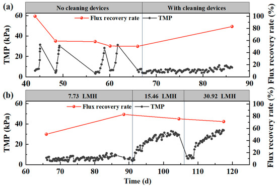 Impact of the fouling control on TMP and flux recovery: (a) initial flux at 7.73 LMH; (b) flux varied from 7.73 to 30.92 LMH.