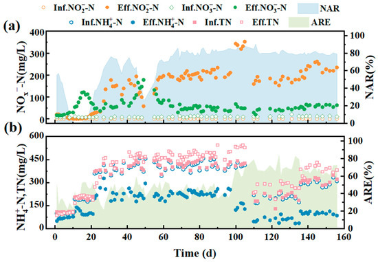 To start up partial nitrification (PN) in MBR system, inoculated sludge with the concentration of 2000 mg/L MLSS was introduced, and the DO was controlled at about 0.1 mg/L (Figures S4 and S5) (See Supplementary Materials). As shown in Figure 4, for the first 10-day operation, feed water at a low nitrogen loading rate (NLR) of 0.1 kg N/m3·d was applied. As the microorganisms in the feeding sludge were less adapted to the new operating conditions, the performance of the reactor was not stable. The removal efficiency of ammonia nitrogen in this period is relatively low, only about 20–30% conversion was observed, and the ammonia removal rate maintained at 0.02–0.06 kgN/m3·d (Figure S6) (See Supplementary Materials). In this period, there was nearly no nitrite accumulation, but a small amount of nitrate production (10–20 mg/L) was detected.