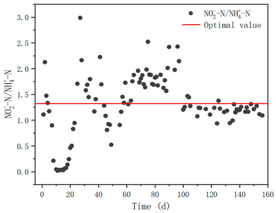 When the effluent NO2−-N/NH4+-N ratio was too high, the higher nitrite content inhibits the activity of anammox bacteria, while when the ratio was low, the substrate was not sufficient and is not conducive to the proliferation of anammox bacteria [37]. Li et al. [37] constructed an SBR reactor to treat synthetic wastewater, and the effluent NO2−-N/NH4+-N was maintained at about 1.37. Chen et al. [38] used 43 days to start up a UASB reactor to treat simulated wastewater with a discharge effluent NO2−-N/NH4+-N of approximately 1:1. The ratio in this study was much closer to the theoretical value, indicating that the effluent could provide stable and effective substrates for autotrophic biological nitrogen removal process.