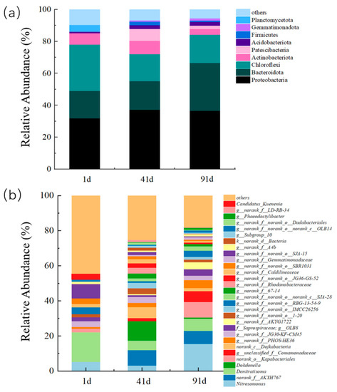 From the phylum level as shown in Figure 6a, it was found that the main bacterial phyla in the MBR system include Proteobacteria, Bacteroidetes, Chloroflexi, Actinobacteriota, and Patescibacteria. During stages operation, the relative abundance of Proteobacteria in the reactor was 31.86%, 37.24%, and 36.66% on days 1, 41, and 91, respectively, showing an increasing trend. Proteobacteria mainly contained a large amount of ammonia-oxidizing phylum and nitrite-oxidizing phylum of microorganisms, and the high abundance of Proteobacteria demonstrated the presence and stable proliferation of nitrifying bacteria in the system. Bacteroidetes were heterotrophic denitrifying bacterium, whose main function was to reduce the nitrate nitrogen present in the wastewater by using complex organic matter, and the relative abundance in the reactor at different stages were 17.33%, 18.03%, and 29.90%, respectively. The higher abundance showed that Bacteroidetes adapted well and dominated in this MBR system. Chloroflexi was mostly facultative anaerobic microorganisms, which were bacteria that do not produce oxygen and cannot fix nitrogen during photosynthesis. Compared with day 1, the richness of Chloroflexi on day 91 was slightly decreased.