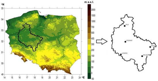 The province’s climate belongs to the temperate climate zone in the area of a mutual intermingling of maritime and continental influences. The average annual temperature is around 8.5 °C, with few frost days throughout the year and low precipitation, especially in the southern and eastern parts. The annual precipitation total ranges from 500 to 550 mm and is one of the lowest in Poland. The province covers an area of 29,826 km2, i.e., 9.5% of the country’s area, and the land use structure is dominated by agricultural land occupying about 65% of its area. Moderately fertile soils (Cambisols and Luvisols) and poor quality soils are predominant (Podzols) [14,15]. Despite this, the region is the country’s largest producer of potatoes, cereals, and sugar beet, the second largest in rapeseed production, and the third largest in vegetable cultivation.