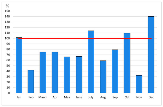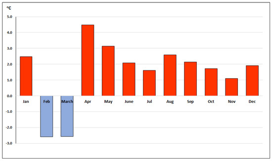 The year 2018 was one of the most unfavourable years for agriculture in this century. The drought, which lasted from April 2018, caused losses to the country’s economy estimated at over EUR 81 million. The greatest damage was recorded in cereals, rapeseed, root crops, and vegetables. Claims for crop insurance were registered, covering 5.4 million hectares of crop area, approximately 38% of agricultural land, and aid was paid to 268,140 beneficiaries for a total of more than EUR 48 million. The development of drought in the discussed year was favoured by the air temperature, with almost every month significantly exceeding the normal of the previous 30 years of 1981–2010 (Figure 2). Only February and March were very cold, which delayed the beginning of vegetation and the phenological beginning of spring in large areas of the country, which started about two weeks later than average. On the other hand, the rapid increase in temperature in April, which turned out to be 4.5 °C warmer than normal, significantly accelerated the development of vegetation and the phenological fullness of spring began across the country about two weeks earlier than average.