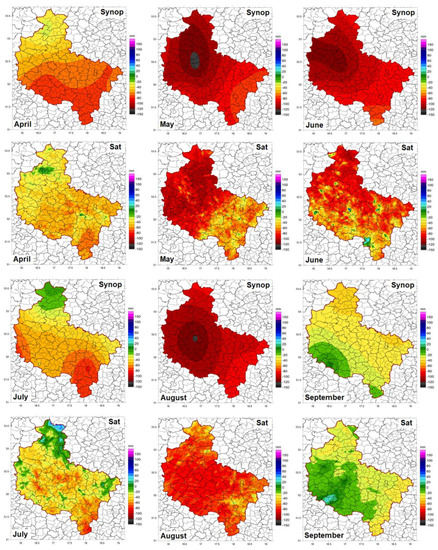 Figure 4 shows the spatial distribution of monthly totals of the Precipitation-Evapotranspiration Index (PEI) for the 2018 growing season. In order to show the differences in the accuracy of the spatial distribution, the PEI values were calculated using two methods: based on data from synoptic stations and the methodology described above. The changes in PEI from month to month reflect very well the temporal distribution of precipitation and reference evapotranspiration, of which air temperature and sunshine duration are considerable components. Significant precipitation deficits, persisting from February onwards, with high evapotranspiration resulting, among others, from significant deviations of positive air temperatures, led to an increasing prevalence of moisture losses over moisture gain and the development of agricultural drought starting from April 2018. In July, due to very high storm precipitation in the middle of the month, the moisture balance temporarily improved, especially in the northern and central parts of the region. Comparing the data obtained with both methods shows a high convergence of PEI values for the month. However, differences in the detailed spatial distribution of the values are also clearly visible. The interpolation of PEI values calculated from synoptic station data is much more generalised due to the small number of such stations. In contrast, the spatial distribution of PEI calculated with kilometre resolution, based on data from the RainGRS product and satellite data (Land SAF METREF product), allows this distribution to be monitored with a high degree of accuracy, indicating areas with higher values, resulting, for example, from local rain showers, which are very frequent during the summer. This is particularly evident in July, when local rainfall was recorded in small areas of eastern and western Wielkopolskie Province that was so high that the monthly totals of PEI were clearly higher than it would be from interpolation based on synoptic data. Such accuracy of the distribution of PEI values, which are one of the key indicators of drought in Poland, allows for the monitoring of the water supply of plants to indicate areas at risk of drought in order to decide on possible irrigation or other treatments to minimize possible crop losses. Differences in the accuracy of the obtained image allow us to conclude that in the case of information based solely on data from measuring stations, their interpretation on a local scale (county, municipality or even a single farm) may be burdened with a significant error and may lead to incorrect conclusions as to the plan for further procedures in field work.