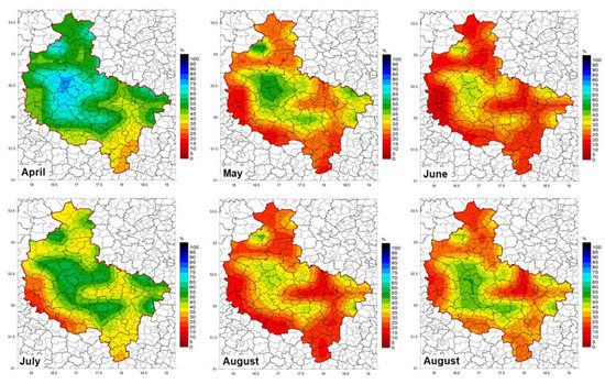 In parallel with the analysis of changes in PEI spatial and temporal distribution, an analysis of the soil moisture index based on satellite data was conducted. Figure 5 and Figure 6 show the spatial distribution of soil moisture index values in the shallower (7–28 cm) and deeper (28–100 cm) root zone in Wielkopolskie Province during the 2018 growing season. The development of soil drought in the 7–28 cm layer is clearly visible as a result of the precipitation deficiency lasting from February, initially in the south of the region (April), where the moisture index fell below 40%, and gradually throughout the province. In May, soil moisture fell below 30% in most of the area, and in June, it fell in almost the entire region, posing a danger of extreme moisture deficiency for all crops. Only in July, as a result of the mentioned storm precipitation, did soil moisture periodically increase, only to decrease significantly again in August, which was very dry in terms of rainfall.