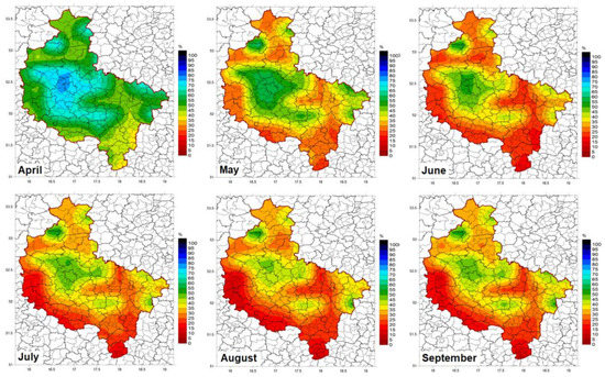 Soil moisture index [%] in the 28–100 cm layer in the following months of the growing season (April–September) 2018.