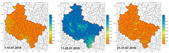 Periods of possible water shortages or excesses are also monitored using the hydrothermal coefficient (HTC). As it allows for the assessment of consecutive dry periods with a 10-day step, it enables the monitoring of conditions with a step sufficient for agrometeorological information service and the assessment of current meteorological conditions. It is usually calculated based on data from meteorological stations, while the use of high spatial resolution products (1 km × 1 km) developed at IMGW allows the assessment of the current situation on a very local scale. To calculate the HTC index, precipitation data from the RainGRS product and temperature data at 2 m from the analysis of the INCA nowcasting model [22], operationally used at IMGW-PIB, were used. The following example also shows how monitoring for shorter periods than a month is essential. The spatial distribution of HTC values in the different parts of July 2018 (Figure 7) shows very significant differences between these periods: extremely dry and very dry in the first ten days of the month, resulting from a lack of precipitation, extremely humid and very humid the second ten days as a result of heavy rains associated with a storm front and again extremely dry in the last ten days of the month. The last ten days of the month also showed locally slightly higher HTC values, resulting from local, minor showers.
