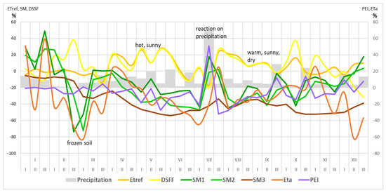 Course of anomalies of selected indices relative to precipitation totals in Wielkopolskie Province in 2018. Etref: reference evapotranspiration, DSFF: down-welling surface short-wave radiation; SM1: soil moisture 0–7 cm; SM2: soil moisture 7–28 cm; SM3: soil moisture 28–100 cm; Eta: actual evapotranspiration, PEI: Precipitation-Evapotranspiration.