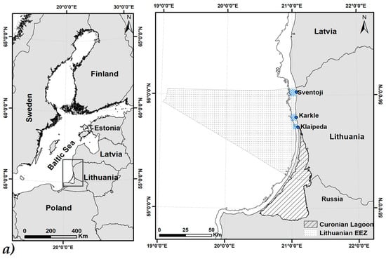 The three sites alongside Lithuania’s seashore were studied in this survey, representing spatial replicates that are also characterized by different bottom types, i.e., Klaipeda at the end of Curonian Spit, which is predominated by the bare sand seabed, and Karkle and Sventoji (Figure 1) that contain diverse bottom types, including stones, gravel, coarse, medium, and fine sands with patches of macroalgae [37].