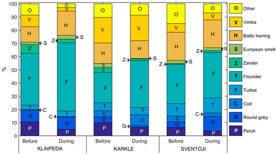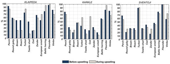 The most abundant species recorded in the whole dataset both, before and during upwelling was flounder. It was observed during all fish samplings in Sventoji and was also the most frequently observed fish during samplings in Klaipeda and Karkle. In addition, perch (Perca fluviatilis), vimba (Vimba vimba), and Baltic herring were relatively abundant in all sampling locations. The comparison of the frequency of occurrence of different fish species before and during upwelling (Figure 2) showed that, for example, the occurrence of perch decreased by 8 to 12% during upwelling. The frequency of vimba occurrence was observed to decrease in Klaipeda and Karkle by 12–14%. Twaite shad (Alosa fallax) appeared to be less commonly observed, especially in Klaipeda, where the frequency of its occurrence dropped by 35%. The frequency of freshwater fish species occurrences, such as bream (Abramis brama) and roach (Rutilus rutilus), decreased up to two times in Klaipeda, while there were no considerable changes in other sites. On the other hand, turbot was more commonly observed during upwelling than before with an increase of frequency by 11% in Klaipeda and by 24% in Karkle. It is also interesting to note that not-so-common fish species in the SE Baltic Sea, i.e., two individuals of fourhorn sculpin (Triglopsis quadricornis), three individuals of sole (Solea solea) were only observed during upwelling.