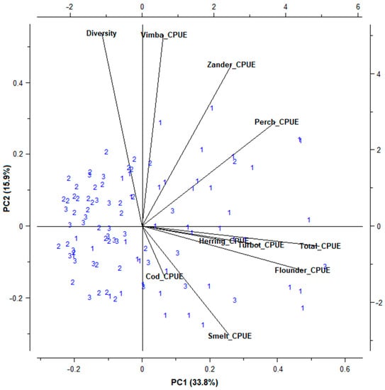 PCA correlation biplot for the diversity and square-root transformed total and main species CPUE of coastal fish assemblages under upwelling conditions. Blue number of samples refers to the fish assemblages from different sampling locations: 1−Klaipeda, 2−Karkle, 3−Sventoji.