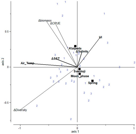 RDA triplot for coastal fish assemblage characteristics (changes in total CPUE abundance (ΔCPUE), biomass and diversity index) with upwelling (UI, ΔSST, ΔSalinity) and other environmental parameters such as air temperature, and the moon phase, sampling location (Klaipeda, Karkle, and Sventoji) and sampling period (spring and summer) used as nominal explanatory variables. The numbers refer to the fish assemblages from different locations: 1−Klaipeda, 2−Karkle, 3−Sventoji.