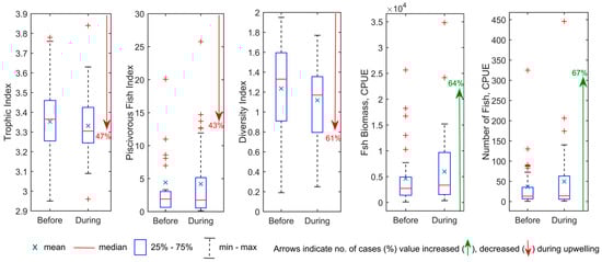 The minimum, maximum, mean, and median values of fish community-based ecological indices, fish biomass, and number of fish before and during an upwelling event. Boxplots indicate 25–75% percentiles.