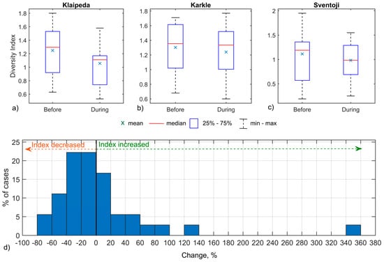 The minimum, maximum, mean, and median values of the Diversity index in all three study sites. Boxplots indicate 25–75% percentiles (a–c). Percentage change of Diversity index during upwelling event (d).