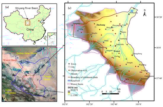 Location of (a) the Shiyang River Basin, (b) the Wuwei sub-basin, against the Shiyang River basin, (c) elevation distribution of the Wuwei sub-basin.