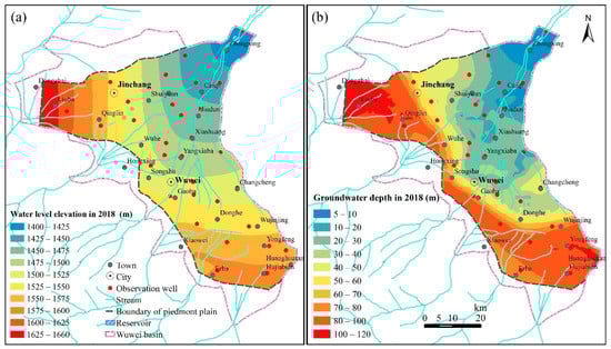 Distribution of (a) water level elevation in 2018, (b) groundwater depth in 2018.