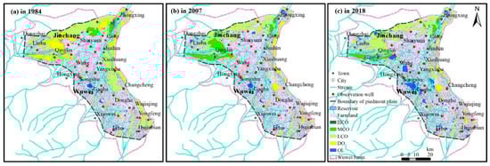 Distributions of land use/cover types, (a) in 1984, (b) in 2007, and (c) in 2018.