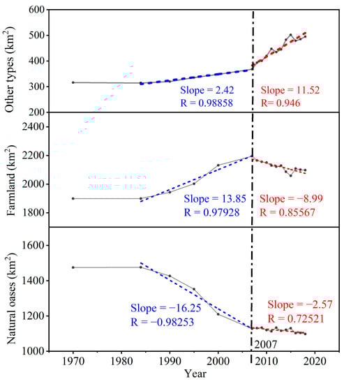 The areas of farmland, natural oases, and OL since 1970 are presented in Figure 6. From 1970 to 1984, human activities were stable, and there were no significant LUCCs. From 1984 to 2007, the farmland and OL expanded at rates of 13.85 km2/year and 2.42 km2/year, respectively, while the natural oases decreased at a rate of 16.25 km2/year. From 2008 to 2018, the OL expanded at a higher rate of 11.52 km2/year, while farmland and natural oases decreased at rates of 8.99 km2/year and 2.57 km2/year, respectively.
