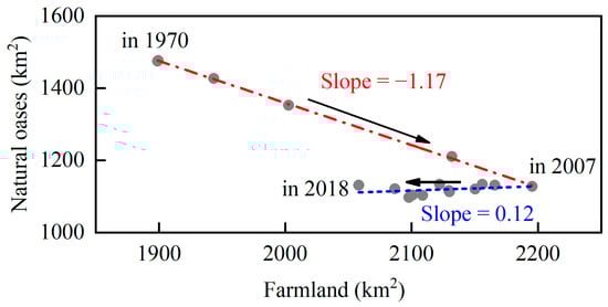A correlation analysis between the farmland area and the natural oasis area (Figure 7) revealed that the natural oasis area decreased by 1.17 km2 for every 1 km2 of increase in farmland area before 2007. After 2007, the natural oases recovered by only 0.12 km2 for every 1 km2 of increase in farmland area. That is, only 0.12 km2 of every 1.17 km2 of the original natural oases were restored after the natural oasis–farmland–return to natural oasis conversion process was implemented. This indicates that, to some extent, relatively speaking, the natural oases lacked vegetation species diversity and the ecosystem structure was simple and extremely fragile, i.e., the ecosystem stability was low, and it would be very difficult to achieve system recovery in the event of ecosystem damage [22].