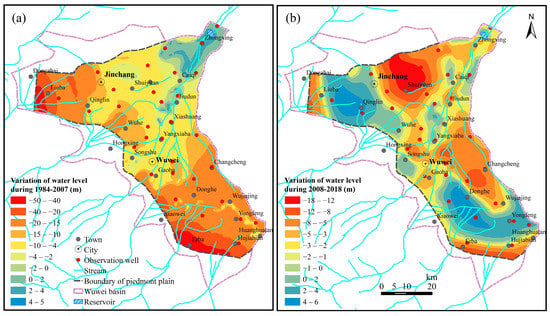Groundwater depth changes in the plain during (a) 1984–2007, and (b) 2008–2018 (negative values denote water-level decline).