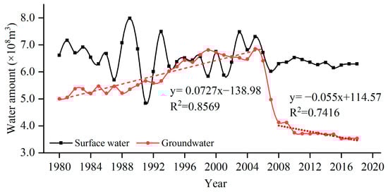 After 1984, the farmland underwent erratic expansion, followed by the implementation of the Grain-for-Green Project. In addition, the groundwater storage volume also underwent a rapid depletion to slow recovery process. The missing early data for the groundwater storage volume can be predicted using the established linear regression equation. The farmland area was 1899.43 km2 in 1984, and it increased by 295.52 km2 in 1984. Assuming that the surface water conveyance volume and groundwater extraction volume in 1984 were the same as in 2007, the rate of change of the groundwater storage volume in 1984 was estimated to be −7319.5 × 104 m3/year. With the implementation of the CTSRB, the farmland decreased to 2097.8 km2 in 2018, and the rate of change of the groundwater storage volume was −7270.4 × 104 m3/year in 2018. The groundwater in the study area was in a negative balance all year round and was extracted in large volumes. To ensure water resource management in the basin and to achieve sustainable development of the basin, it is necessary to implement and improve integrated basin management initiatives sustainably and efficiently.