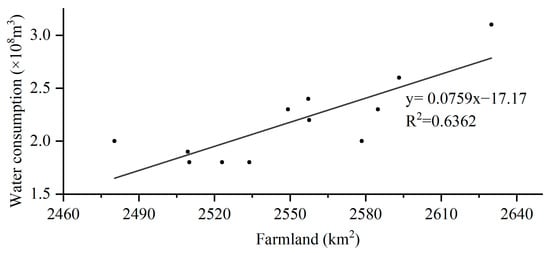 where R2 = 0.9434, indicating a good fit of the linear regression equation to the groundwater storage volume. The significance test (Table 4) showed that the changes in the groundwater storage volume were significantly correlated with the farmland area (p < 0.05) and were extremely significantly correlated with the surface water conveyance volume and groundwater extraction volume (both p < 0.01). That is, the linear regression equation fitted the raw data well and was reliable.