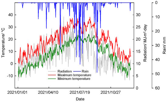 Meteorological information from the experimental site in Baishui, Shaanxi Province, China. Radiation (grey line), rain (blue line), maximum temperature (red line), and minimum temperature (green line) were recorded daily in 2021.