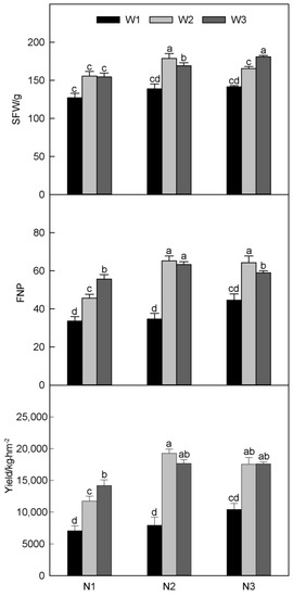 Single fruit weight (SFW), fruit number per plant (FNP), and yield (Y) are influenced by irrigation (W1, W2, and W3) and nitrogen (N1, N2, and N3). Error bars indicate the standard error of the mean values (n = 3). The different letters for each data point represent the differences between the treatments based on Duncan’s analysis at p < 0.05. The statistical comparisons between different factors are listed in Table 3.