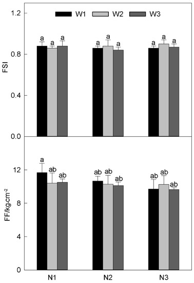 Fruit shape index (FSI) and fruit firmness (FF) as influenced by irrigation (W1, W2, and W3) and nitrogen (N1, N2, and N3). The error bars indicate the standard error of the mean values (n = 3). The different letters for each data point represent the differences between the treatments based on Duncan’s analysis at p < 0.05. The statistical comparisons between different factors are listed in Table 3.