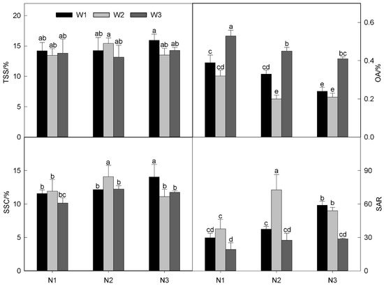 Total soluble solids (TSS), organic acids (OA), soluble sugar content (SSC), and sugar-acid ratio (SAR) as influenced by irrigation (W1, W2, and W3) and nitrogen (N1, N2, and N3). The error bars indicate the standard error of the mean values (n = 3). The different letters for each data point represent the differences between the treatments based on Duncan’s analysis at p < 0.05. The statistical comparisons between different factors are listed in Table 3.