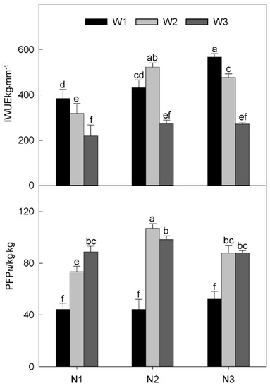 Irrigation water use efficiency (IWUE) and partial factor productivity of applied N (PFPN) as influenced by irrigation (W1, W2, and W3) and nitrogen (N1, N2, and N3). The error bars indicate the standard error of the mean values (n = 3). The different letters for each data point represent the differences between the treatments based on Duncan’s analysis at p < 0.05. The statistical comparisons between different factors are listed in Table 3.