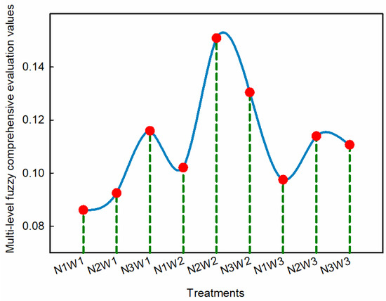 3.5. Responses in the Comprehensive Growth of Apples to the Coupling of Nitrogen and Water Based on Multilevel Fuzzy Comprehensive Evaluation