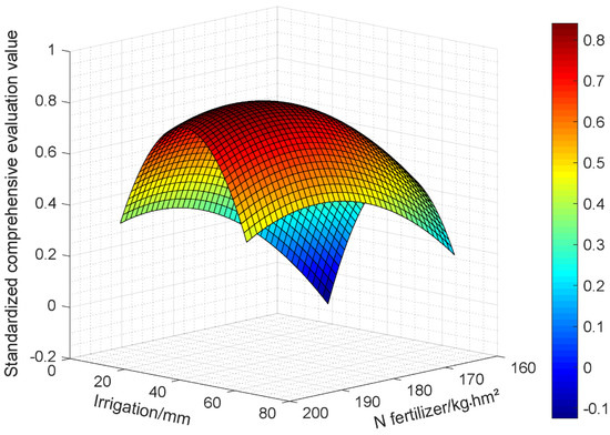 Interactive effects of irrigation and N fertilizer application on the comprehensive growth of apples in Baishui, Shaanxi Province, China. The x, y, and z axes represent the values for irrigation, N fertilization, and standardized comprehensive evaluation based on the multilevel fuzzy comprehensive evaluation method. The depth of the color bar denotes the size of the standardized comprehensive evaluation value.