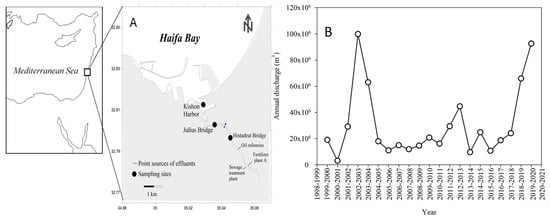 The Kishon river drainage basin occupies approximately 1100 km2, with intensive agricultural activity taking place within its drainage basin. The Kishon outflow enters Haifa Bay located in the southeastern Mediterranean Sea (Figure 1A), after passing through two harbors (Kishon and Haifa harbors). It is characterized, as many other Israeli coastal rivers outflowing the southeastern Mediterranean Sea, by low base flows, with discharges varying between 0.02 and 0.2 m3 s−1 in the summer and between 0.2 to 0.6 m3 s−1 in the winter []. The 7-km long estuary is exposed to the penetration of seawater because its bathymetry lies below sea level, thereby producing a highly stratified water column. The total annual discharge ranges between 3.8 × 106 and 1 × 108 cubic meters (Figure 1B), with a three decades annual average of 30.3 × 106 cubic meters (Israeli Water Authority Hydrological Reports). Along the estuary, there are two industrial plants producing fertilizers, an oil refinery, a sewage treatment plant [], and additional smaller industries (Figure 1).