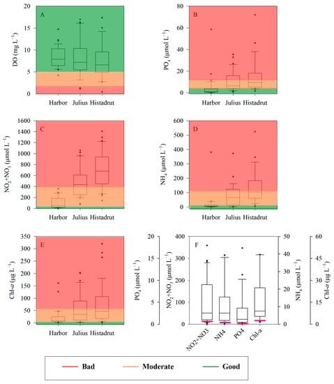 Whisker box plots showing the distribution of DO (A), PO43− (B), NO2− + NO3− (C), NH4+ (D), and chl-a (E) in the surface water of the Kishon Estuary between 2002–2021. Background colors represent the water quality thresholds as suggested here for small stratified inland estuaries (see Table 2), where red stands for bad water quality, orange for moderate, and green for the good ecological state. The nutrients and chl-a threshold between good ecological status (GES) and non-GES for Haifa Bay coastal water (SE Mediterranean Sea) derived from Kress et al. (2019) [] are shown as pink lines within the box plots generated for the harbor station (F).