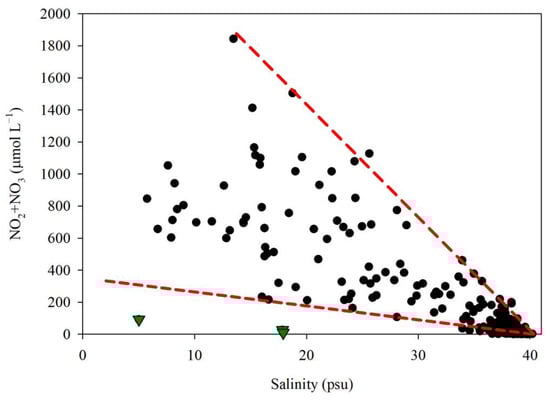 Relationship between NO2− + NO3− concentrations and salinity in surface water at three stations along the Kishon lower estuary between 2002–2021. The bottom green triangles represent measured values at a period of almost no anthropogenic discharge (November 2017) due to a strike at the fertilizer industrial plant. The red lines represent mixing curves between the highest and lowest NO2− + NO3− levels in the fresh/brackish water endmember and the seawater endmember (salinity ~40 psu).