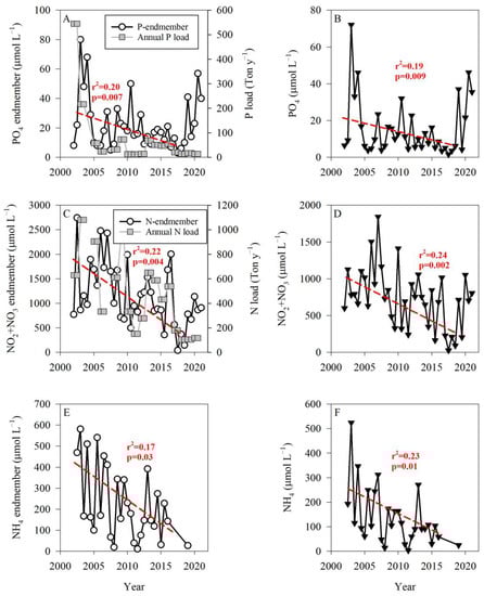 Time series of the calculated anthropogenic freshwater nutrient endmembers using Equation (3) ((A,C,E), circles) and the time series of the measured nutrient concentrations at the surface water of the Histadrut station ((B,D,F), triangles). Data are shown for PO43− (A,B), NO2− + NO3− (C,D), and NH4+ (E,F). The total N and P loads into the Kishon river from anthropogenic point sources are presented as well (source: Israel Ministry of Environmental Protection, 2021 Report on pollutants budget; www.gov.il/he/departments/guides/kishon_stream_point_pollution_loads?chapterIndex=5, accessed on December 2022). The loads were calculated using the annual cumulative effluent discharge per point source multiplied by the annual average N and P concentrations. Note the different Y axis. The red lines show the linear decreasing trends for the period 2002–2018.
