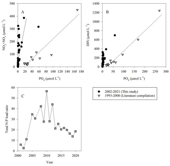 Relationship between NO2− + NO3− (A) or DIN (B) vs. PO43− concentrations in surface water at the Kishon harbor during this study, 2002–2021 (black circle) and measurements performed during 1993–2000 (white triangles, [,]). The linear regression slopes for this study and 1993–2000 in panel A are 17.3 and 2.6, and in panel B are 11.3 (or 17.6 excluding the high anomalous value) and 4.6, respectively. The anthropogenic N:P load ratio is shown in panel (C) (grey square, calculated from the source: Israel Ministry of Environmental Protection, 2021 Report on pollutants budget; www.gov.il/he/departments/guides/kishon_stream_point_pollution_loads?chapterIndex=5).