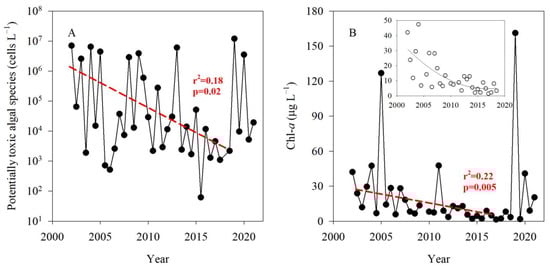 Temporal variability of potentially toxic alga abundance (A) and chl-a (B) in the Kishon’s Harbor station between 2002–2021. The red lines indicate the decreasing trend in 2002–2018 for both potentially toxic alga (A) and chl-a (B). Insert: chl-a levels between 2002–2018 excluding ‘abnormal’ peaks in 2005 and 2011.