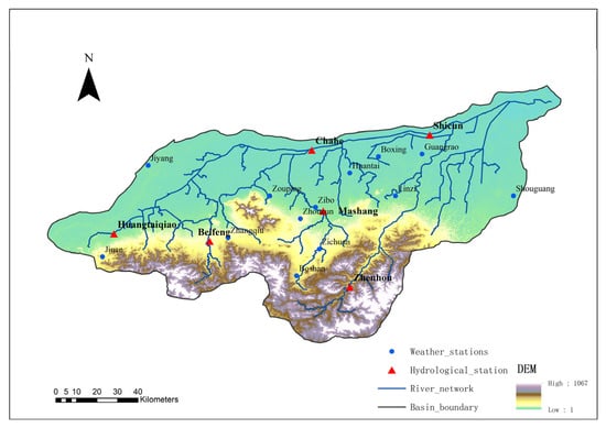 The distributed hydrological model of Xiaoqing River basin includes the following six types of basic data: (1) Hydrometeorological data; (2) geographic elevation and topographic data; (3) river network data; (4) soil and hydrogeological data; and (5) land use and vegetation cover data. Data descriptions and sources are provided in Table 1.