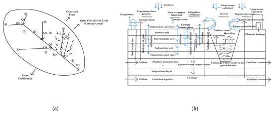 The model uses sub-streams and contours as the basic calculation unit, thus effectively avoiding the “big basin coarse grid”-related distortion of water balance and flow path distortion, and the reasonable expression of hydrological variables is ensured through the space variation characteristic of the variable water (VSA) production flow theory, the implementation of river basin water, and process energy exchange coupling simulation. The horizontal and vertical structures of the model are shown in Figure 2. There are 10 types of underlying surface in the basic calculation unit: Water area, impervious area, forest land, grassland, bare land, irrigated farmland, non-irrigated farmland, sloping farmland, terraced fields, and dam land. The model is vertically divided into nine layers: Vegetation canopy, surface depression reservoir, the surface soil, the soil in the middle, the underlying soil, transition layer, shallow groundwater layer, difficult permeable layer, and confined aquifer [25].