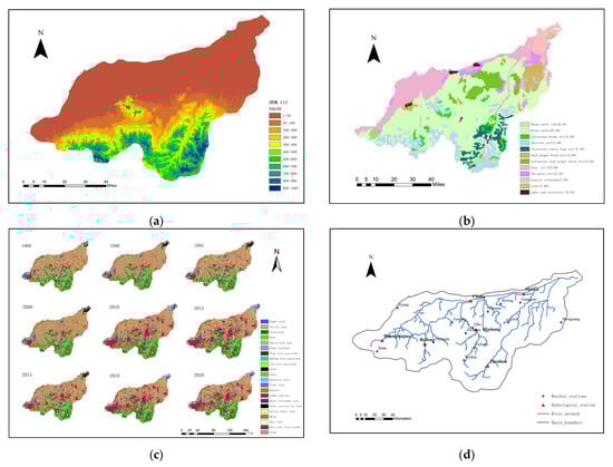Basic hydrological data of Xiaoqing River basin: (a) Digital elevation map reflecting the topography of the study area; (b) soil type map, divided into 12 categories; (c) land use type map, divided into 22 categories; and (d) distribution of hydrological and meteorological stations, including 6 hydrological stations and 12 meteorological stations.