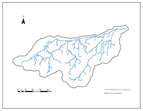 The WEP river network includes an actual river network and virtual river network. The actual river network was obtained by measurement, and the extraction of the virtual river network mainly involved the following steps: Cutting, full classification, and filling of DEM. According to the measured river network, the DEM elevation was lowered. We calculated the “flow direction” and “sink”, determined the water threshold, determined the location of the basin reservoir, lake, and basin outlet, defined segmentation points, and, finally, extracted and calculated the virtual river network. The virtual river network of Xiaoqing River basin is shown in Figure 4.