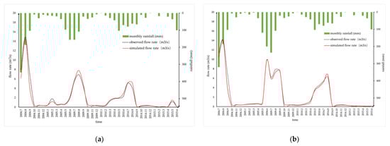 We considered the period 1980–2020 for monthly runoff process simulation in Xiaoqing River. According to the hydrological frequency analysis, we selected 2004, 2009, and 2014 as representative years, and the simulation results are shown in Figure 5. It can be seen that the simulation results at the site were consistent with the observed data (Figure 6). The NSE of Huangtaiqiao Station was 0.85, Re was 0.12%, and R2 was 0.79; while the NSE of Beifeng Station was 0.79, Re was −0.23%, and R2 was 0.81.