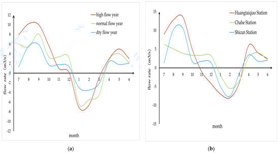 Simulation results of monthly discharge at hydrological stations: (a) Change in exchange capacity in Jinan section during abundant and dry season; and (b) change in exchange capacity in the upper, middle, and lower reaches of Xiaoqing River basin. Huangtaiqiao Station, Chahe Station, and Shicun Station are in the upper, middle, and lower reaches of the basin, respectively.
