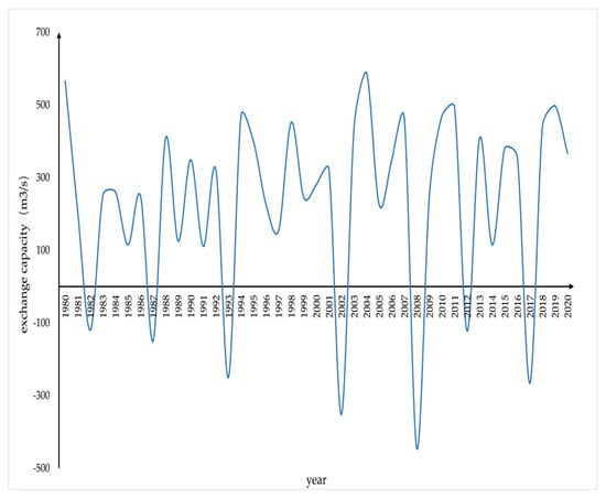 The variation of exchange volume in the Jinan section of Xiaoqing River from 1980 to 2020 is shown in Figure 8. It can be seen that the exchange volume of surface water and groundwater fluctuated continuously over the long sequence, but tended to be stable as a whole. In most years, the Xiaoqing River replenishes the groundwater while, in some years, the groundwater is discharged to the Xiaoqing River.