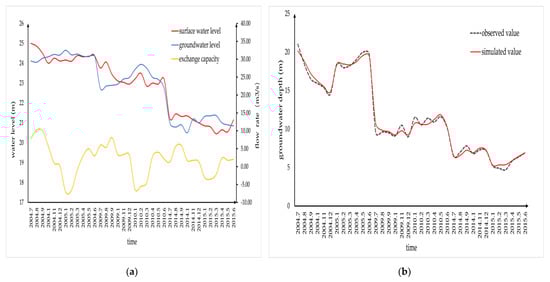 Comparison of WEP-simulated and observed values: (a) Comparison of groundwater level and exchange capacity of surface water in Jinan section of Xiaoqing River; and (b) comparison of groundwater depth in Jinan section of Xiaoqing River.