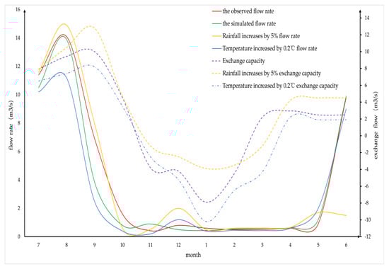 When rainfall increases by 5%, compared with the initial exchange capacity, the groundwater discharge to surface water decreases, the surface water level rises, the cross-section discharge increases, the difference between surface water and groundwater levels increases, and the surface water supply to groundwater increases in the wet season. Under a temperature increase of 0.2 °C, the evaporation of surface water is enhanced, thus affecting the infiltration of soil water simultaneously. The cross-section discharge decreases, and the interaction between surface water and groundwater has a weakened effect. The overall trend was that the interaction quantity and the total runoff both decreased.