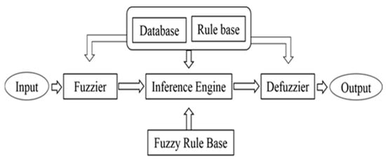 ANFIS uses both artificial fuzzy logic and a neural inference system. It has a hybrid approach to estimate the variables, a least square to evaluate the linear variable, and an inaccuracy back-propagation algorithm to estimate dynamical parameters []. ANFIS is comprised of five layers. The linear parameter is estimated in the first layer []. The idea of fuzzy sets, in which there is no sharp or obvious border, underpins fuzzy logic, which is multi-valued and deals with degrees of membership and truth, unlike two-valued Boolean logic. In fuzzy logic, a membership value is any logical value from the set of real numbers between 0 (totally false) and 1 (entirely true). The function that encodes such values is called a membership function. Artificial neural networks’ learning ability and relational structure are integrated with fuzzy logic’s decision-making process. As for artificial neural networks, ANFIS achieves learning with samples using a training data set. As a result, the most optimal ANFIS structure for solving the associated problem is obtained. The acquired structure is put to the test to see how it reacts to materials []. Membership functions are available in a multitude of shapes, including triangular, trapezoidal, Gaussian, sigmoidal, and so on, and are chosen depending on the application. Fuzzy logic contains its own set of logical operators, such as AND, OR, NOT, and others []. Each of these operations has its meaning based on the membership value idea. The other key fuzzy logic components are fuzzy rules, which connect the fuzzy sets. If the rule is correct and the antecedent is correct, the consequent must also be correct, following the IF-THEN rule. As shown in Figure 2, the four phases of a typical fuzzy inference system (FIS) are as follows: (a) fuzzification of input variables, (b) evaluation of each rule’s output, (c) aggregation of several rules’ outputs, and (d) defuzzification, which converts fuzzy results into crisp output.