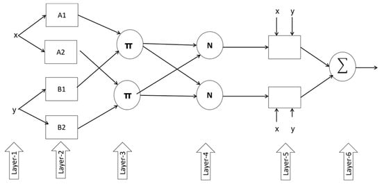 where the premise parameters are pi, qi, and ri. The user defines the premise parameters, which must be optimized using the ANFIS training method. In a fuzzy system with two membership functions, A1 and A2 represent the input x membership functions, while B1 and B2 represent the input y membership functions. Figure 3 shows the ANFIS architecture with two input parameters (x, y) and one output parameter (f). It is worth noting that each layer’s node has the same functions described in the sections below. The output of the layer node ith is represented by Ol,i. The layers are described below.